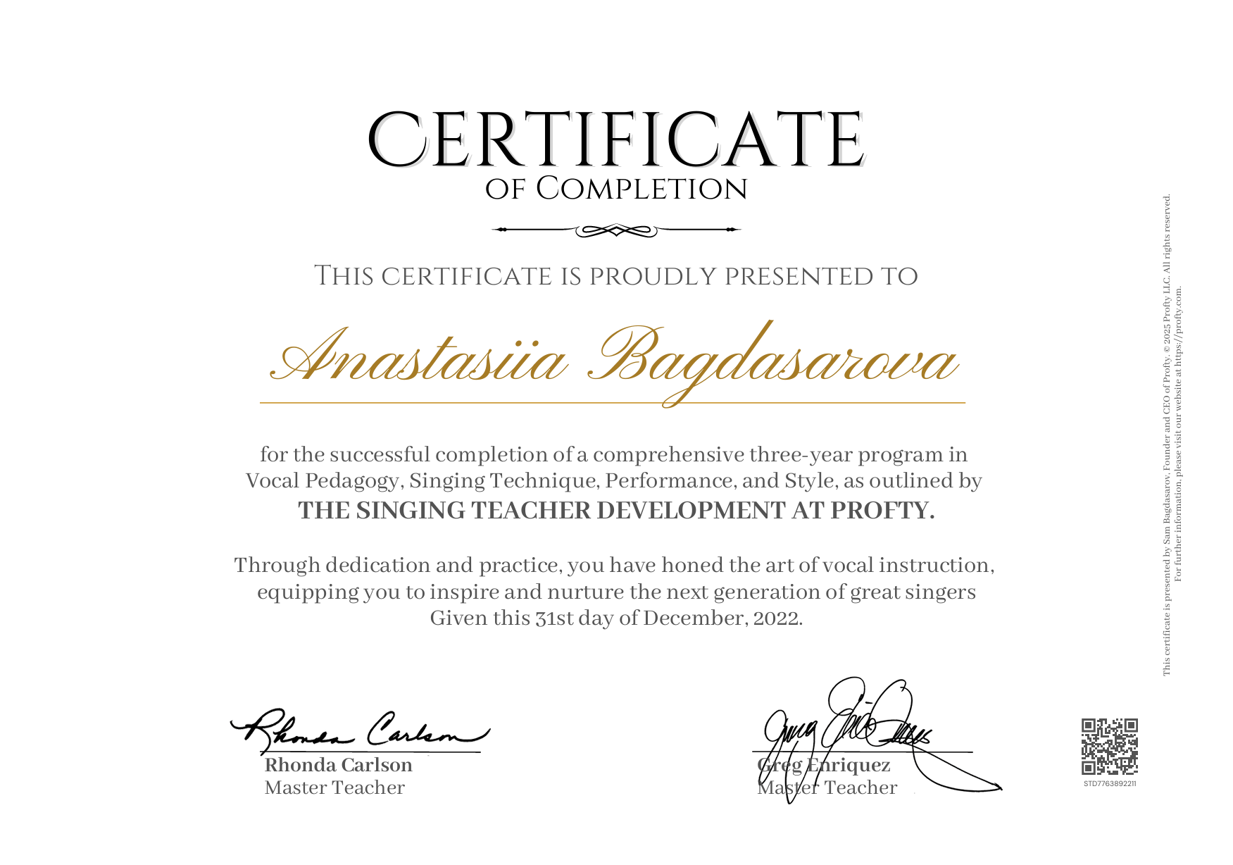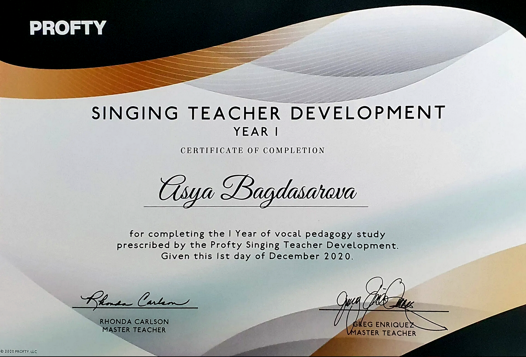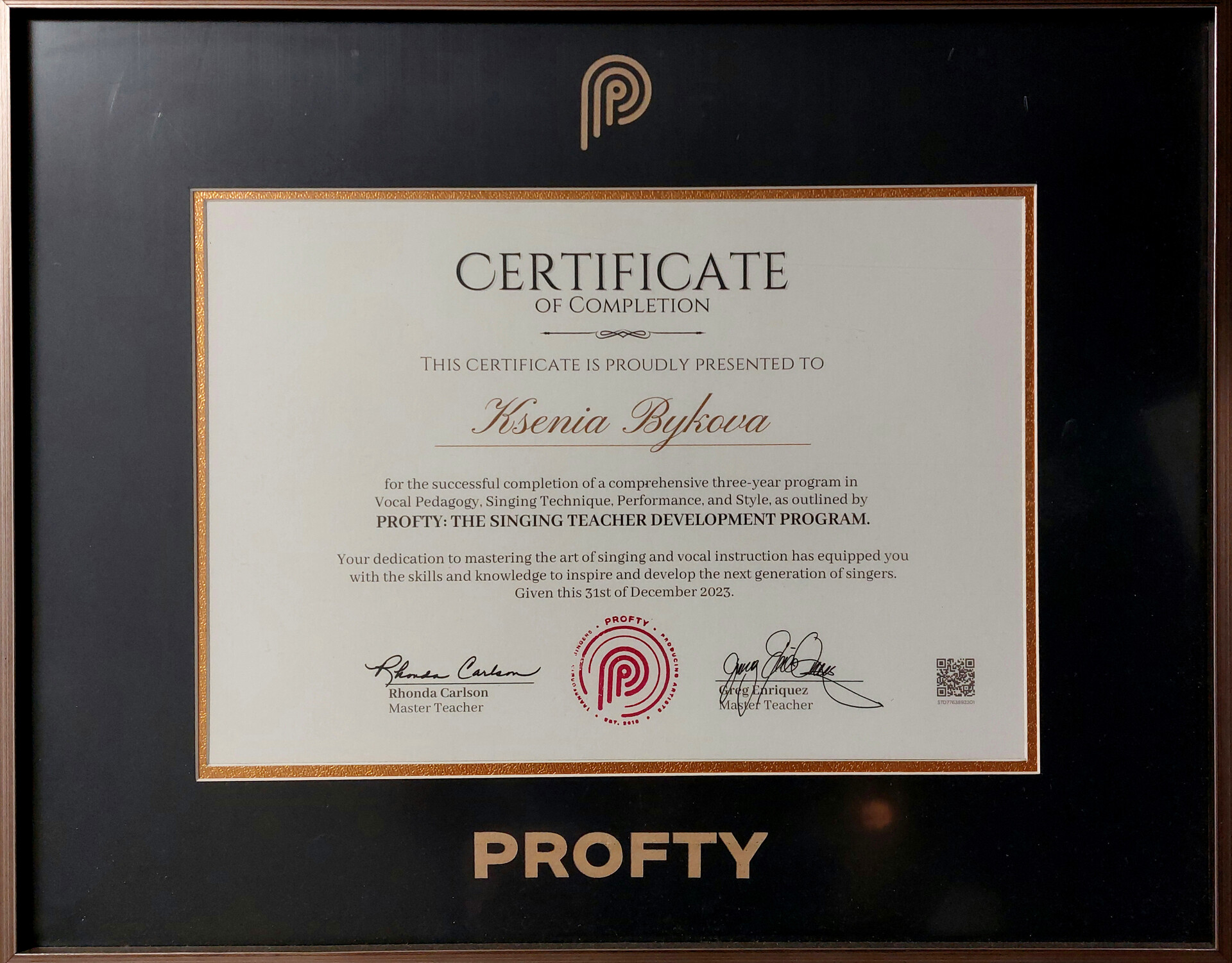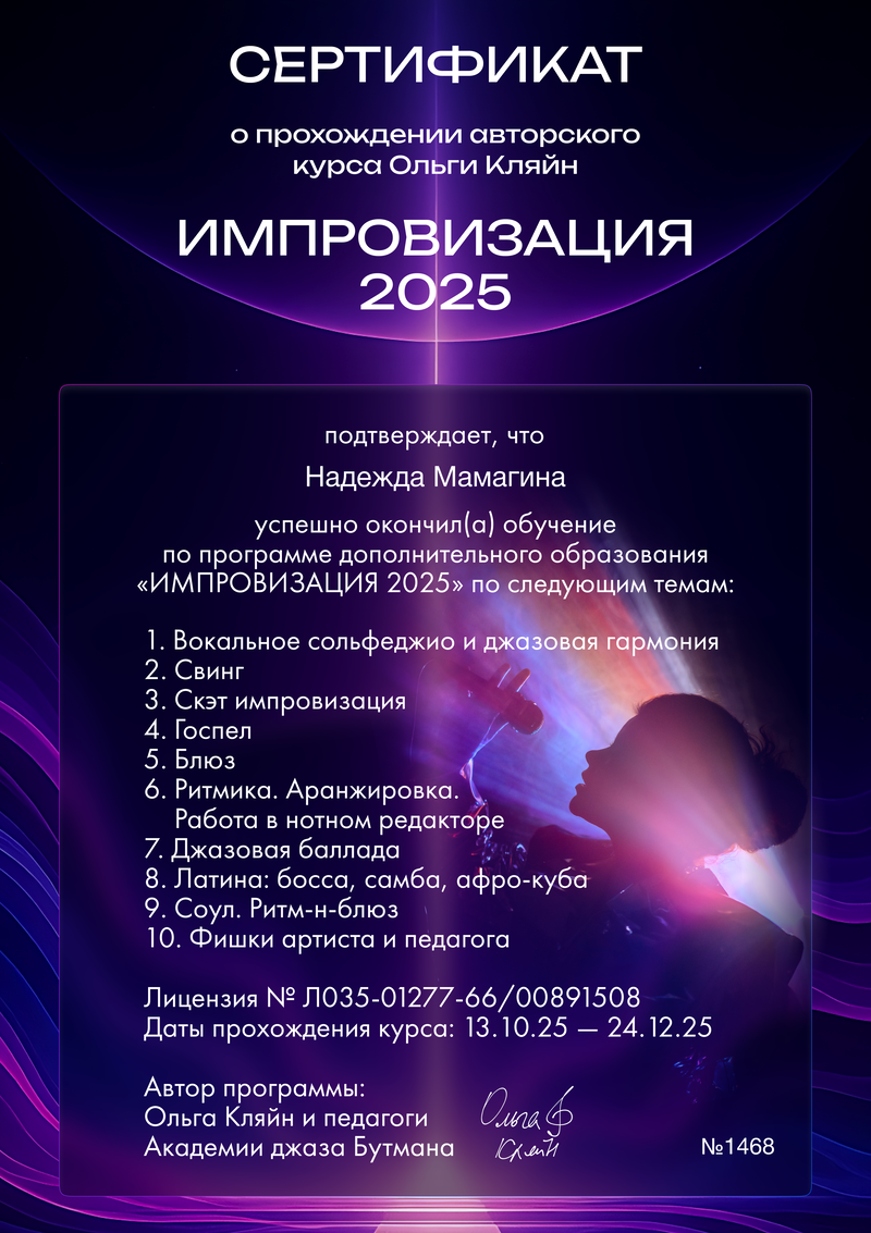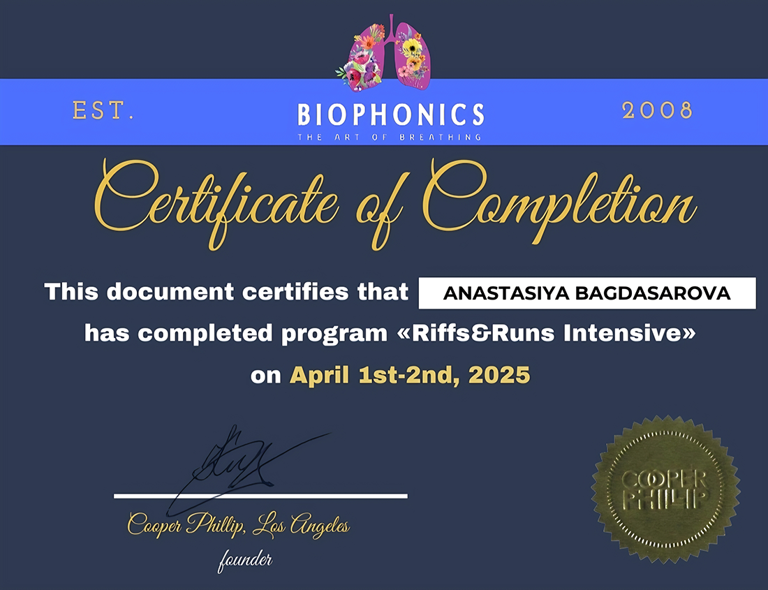 - В 2022-ом - окончила трёхлетний курс (да, он шёл параллельно с муз.менеджментом) «Singing Teacher Development». Это курс повышения квалификации и профессиональной сертификации педагогов по вокалу от лучших преподавателей и преподавательниц из США. Никаких видео-уроков, только постоянное общение с преподами, теория, практика пения и практика преподавания!